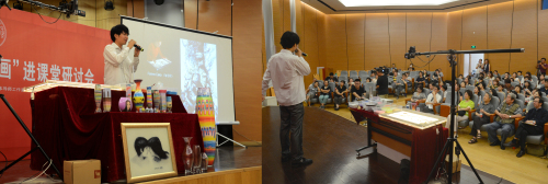 院长丁方致开场辞,提出绘画艺术的发展更需要对艺术材料进一步研究和实验,在赵前导师工作室的带领下,沙画艺术可以有更好的发展。第二,王楠老师展示了他进行了8年之久的沙画艺术作品,并现场制作沙瓶画,讲述沙画与各艺术领域结合的可能性,带给现场无数惊喜。