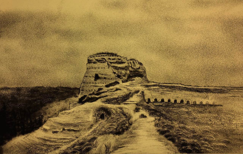 图-6用沙画绘制的统万城遗址的一角(西城角楼)