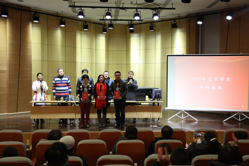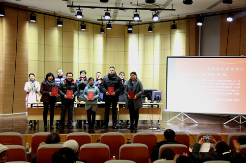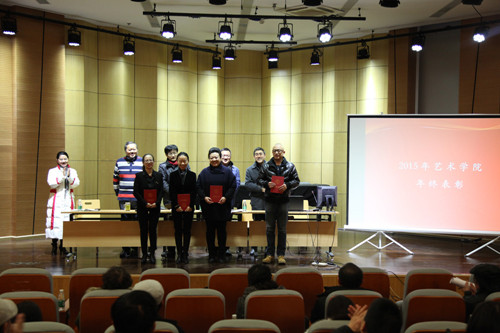 大会第二项议程进入对本年度优秀团体和个人教师的表彰环节。由赵方等六位教师组成的“赴德演出教师团队”、由郑晓红等三位老教师组成的“学位证书设计团队”以及顾亚奇、程兰、乐丽君老师,因在2015年为学院做出的突出贡献被授予2015年度“院长特别奖”;由各系推荐闫平、童岩、周源、王文娟老师因在教学、科研上取得的突出成绩,被授予2015年度 “先进个人”称号,大会举行了隆重的表彰颁奖仪式,学院领导为获奖老师颁发荣誉证书。