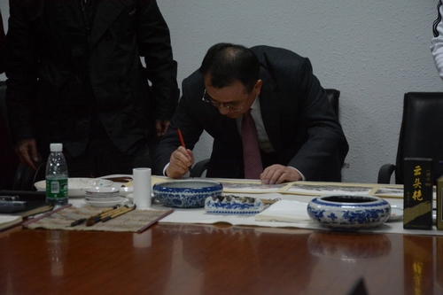 接着,吴书记和同学们一同欣赏了支部成员李海玉和蒋奎元同学现场创作的“我心中的长征”手卷,并对作品做出了极高评价,并在卷轴上题字“我心中的长征”。最后,吴书记及与会领导与同学们合影留念。