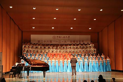 “台上一分钟,台下十年功。”为了此次“一二·九”合唱节,同学们从十月底便开始了相关训练。此时正直北京初冬,瑟瑟的寒风吹透了同学们的外套,却丝毫没有降温大家对于“一二·九”的热情。参加合唱的2014级新生在整个过程中对自己提出了很高的要求,大家相互督促、努力训练,力争借此次机会,用合唱表达自己对祖国的真情和对艺术的热爱。音乐系陈光曦老师积极参与一二·九合唱节工作,参与排练并请来陈泽明老师做艺术指导;团委宁祎老师在校团委文件刚刚下发时就组织学生会同学积极备战;学生会和音乐系同学各自发挥优势,前台后台齐心协力。学院党委副书记别敏副教授在忙完一天的工作后,多次在寒冷的夜晚到排练现场,为同学们加油鼓劲。别老师凭借优秀的艺术素养和丰富的工作经验、舞台表演经验,对整个合唱节工作进行引领和指导。