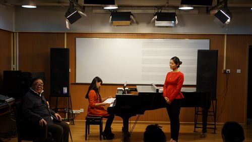 首位声乐硕士研究生。金铁霖教授首先介绍了郝丹丹的学习情况,包括声音特点、演唱风格以及学习过程,随后要求郝丹丹首先进行哼鸣、通道和换字练习,并演唱三首不同类型、不同风格以及不同难度的歌曲,分别是陕北民歌《山丹丹开花红艳艳》、创作歌曲《黄河渔娘》以及经典歌剧选段《万里春色满家园》。金铁霖教授对郝丹丹的演唱从声音技巧、情感表现、吐字韵味等方面进行了详细点评和指导。随后,其他几位同学按照先练声后演唱作品方式,演唱了中国传统民歌、改编民歌、创作歌曲、中国艺术歌曲、中国歌剧选段以及经典外国歌剧选段等各类声乐作品,金铁霖教授进行了逐一指导。整场授课接近3个小时,精彩纷呈、高潮迭起,既像音乐会现场般优美动听,又有声乐比赛现场的紧张激烈,让20多位在场旁听的学生感受到了声乐大师严谨的治学态度和巨大的艺术魅力,纷纷表示受益匪浅。