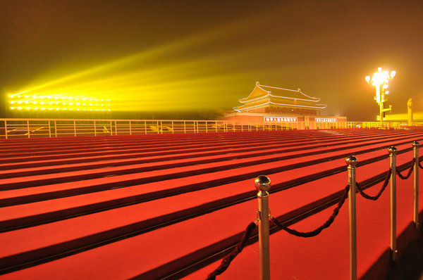 2009年9月17日,北京天安门城楼前金水桥、临时观礼台和广场都铺设红地毯,为建国60周年盛典增添节日喜庆气氛。天安门广场国庆阅兵各项准备工作紧张有序进行