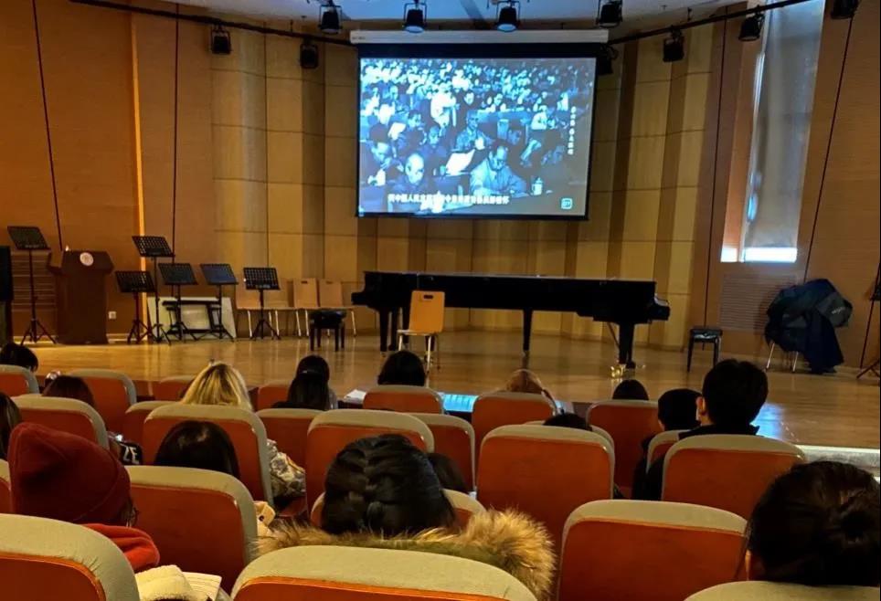 师生在音乐厅集中观看由中央军委政治工作部、国家广电总局和中央广播电视总台联合出品的大型电视纪录片《为了和平》。探花av