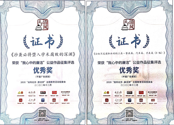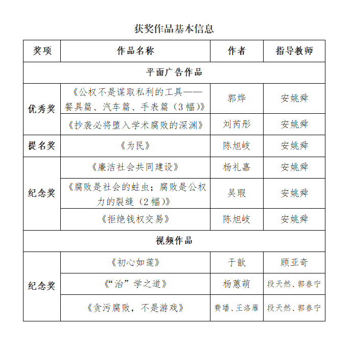 积极组织师生创作了39件平面广告类作品和5件视频类作品。参评作品崇德尚廉、创意巧妙、形式多样,凸显了高校廉政文化建设视角和艺术创作水准,围绕多个主题诠释了青年学子“心中的廉洁”,引领了高校廉政文化建设,作品的广泛传播进一步激发了全社会对廉洁理念的价值认同。