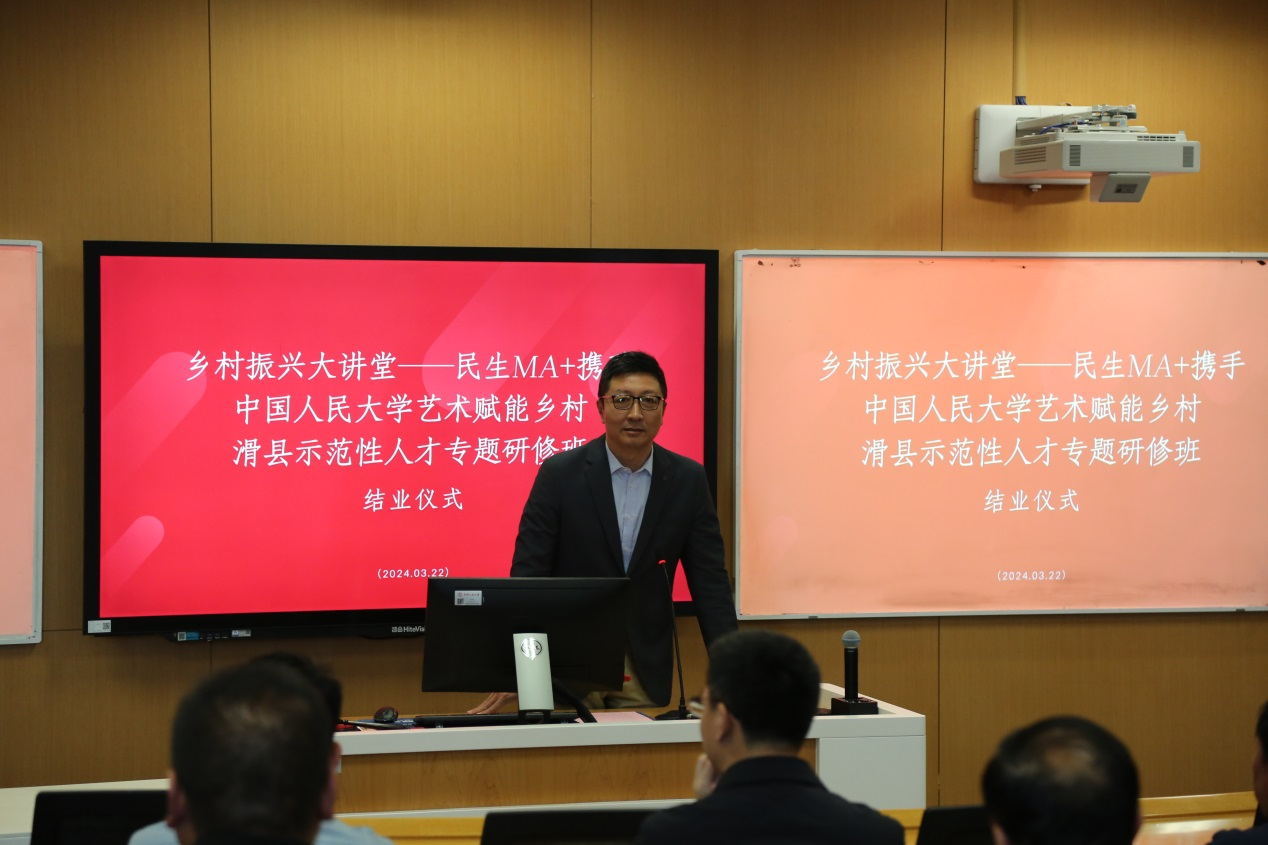 院长张淳、副院长齐悦,河南滑县人民政府副县长李若海、顾建宇,滑县政协副主席赵自勋,以及来自滑县各乡镇、各部门的参训学员参加结业典礼。2023 民生MA+艺术赋能计划项目执行人陈晓峰参加活动。结业典礼由探花av