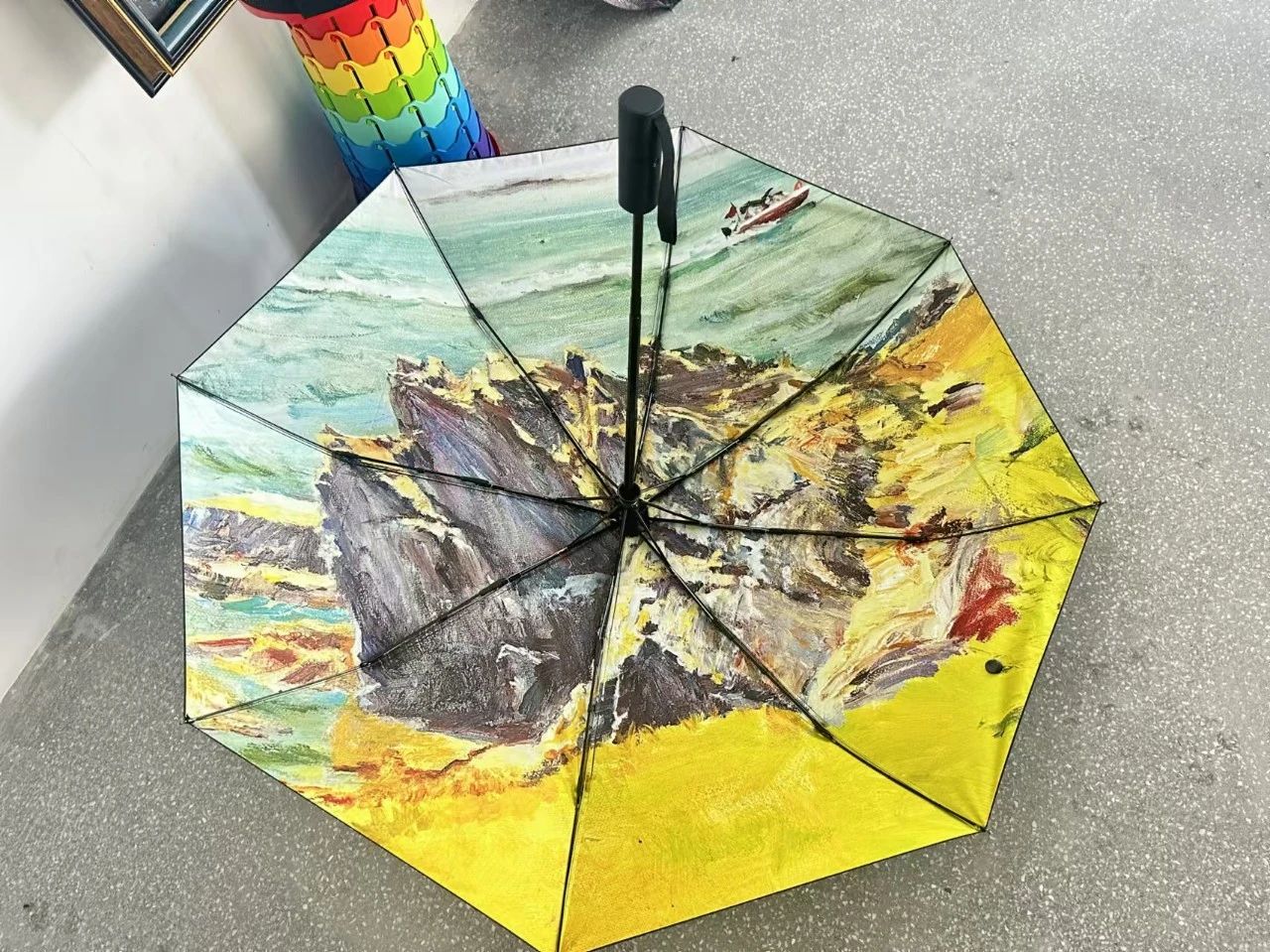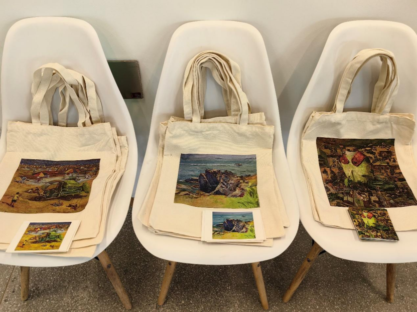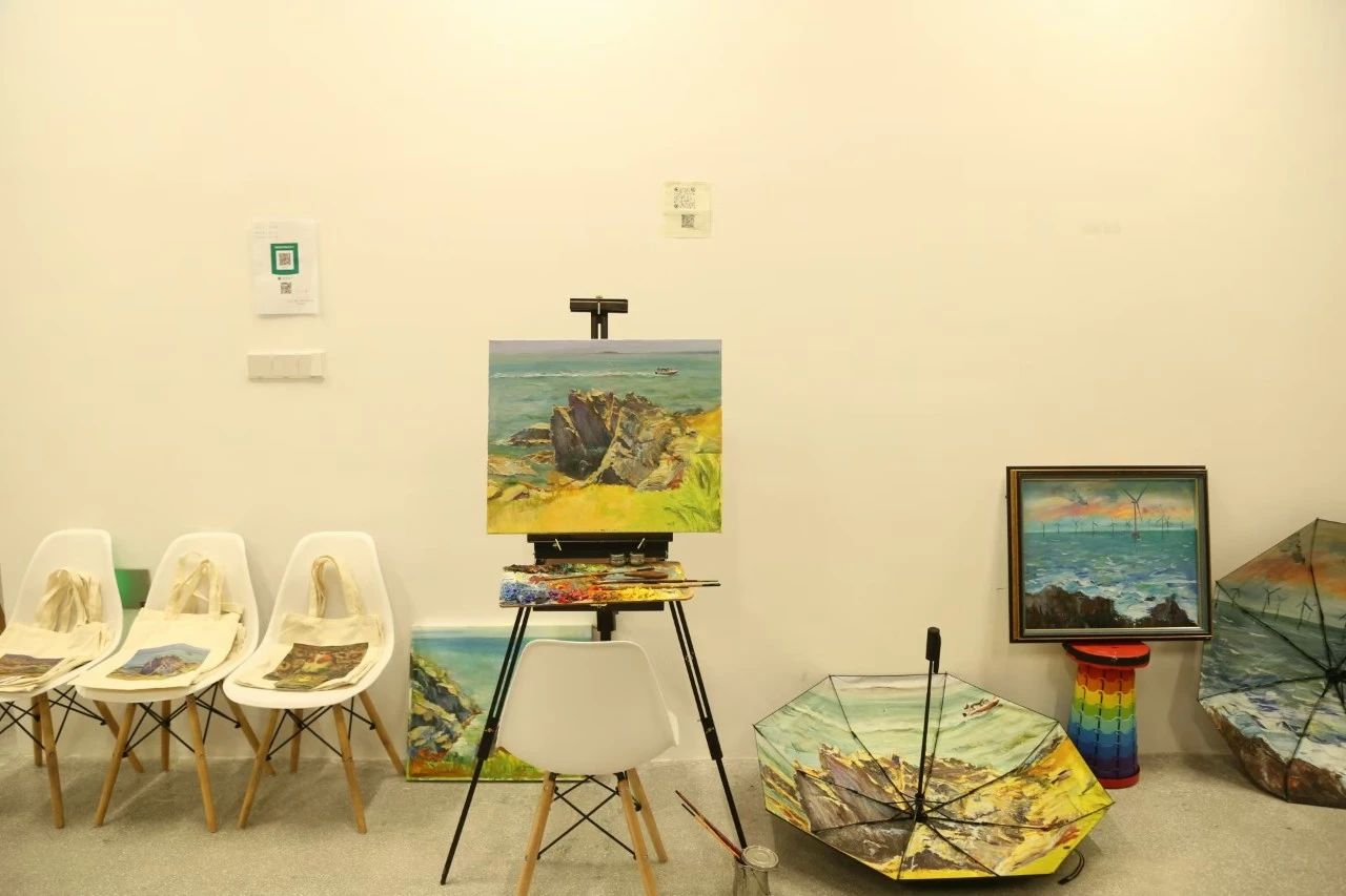 作品旁边,还陈列着他以这些画作为素材制作成的油画帆布袋、明信片以及文创雨伞——画作受到广泛好评与喜爱之后,史惠青决定用它们为当地的文旅宣传做出一些更实在的贡献:他将这些画制作成文创产品,并授权给了当地文旅部门,将平潭风光带来的收益留在平潭。