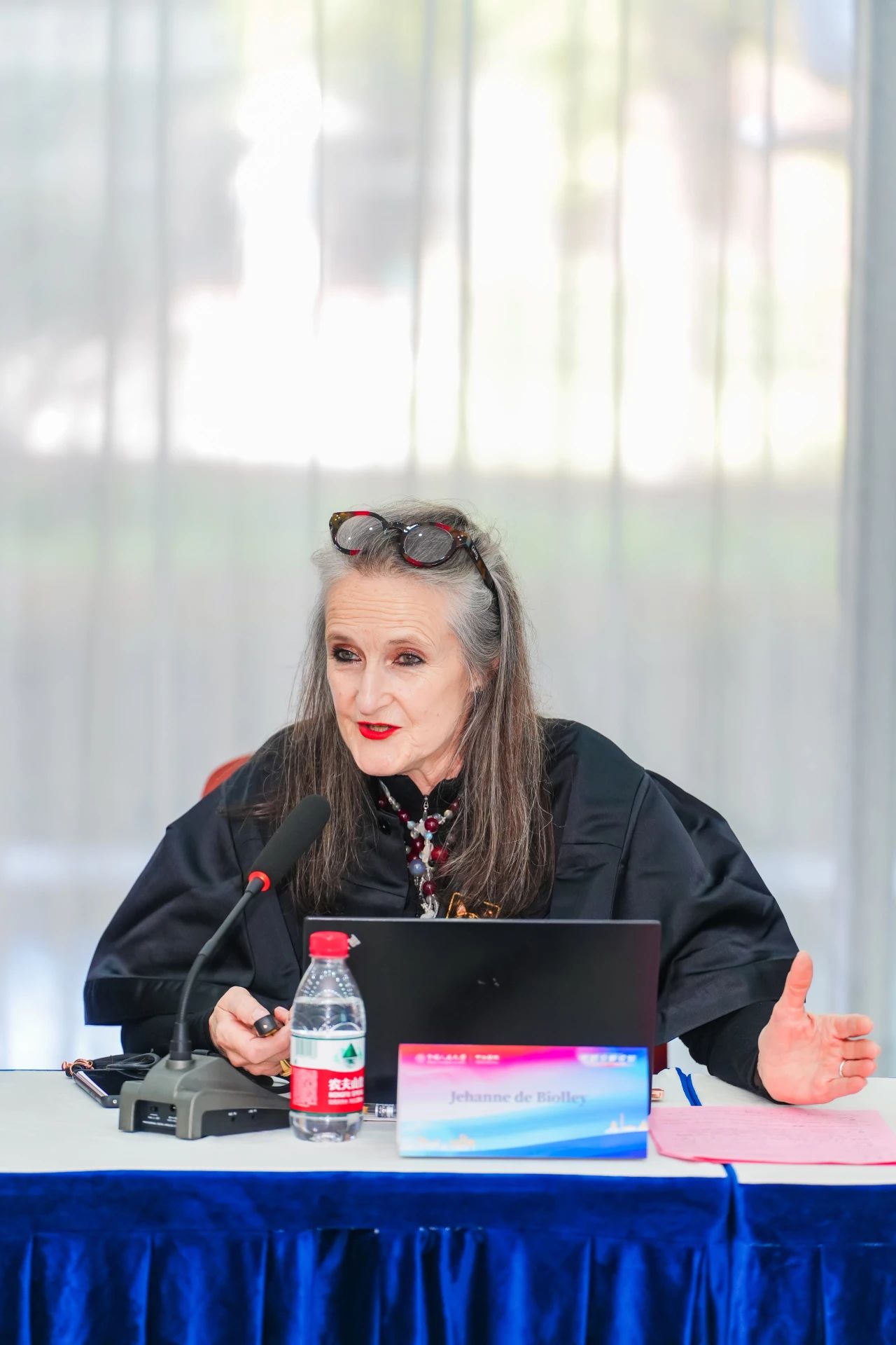 高级时装设计师Jehanne de Biolley(翠翠)女士的演讲题目为《中国时装定制30年》,从设计师的视角回顾了中国时装定制的发展历程,强调了“慢时尚”在当今时尚行业中的重要性。她介绍了她的设计灵感来源于中国少数民族刺绣技艺,特别是苗绣元素,并将这些传统工艺融入现代时装设计中。她认为,中国的传统手工艺在全球化背景下具有独特的价值,未来在中法文化交流中将起到重要作用。