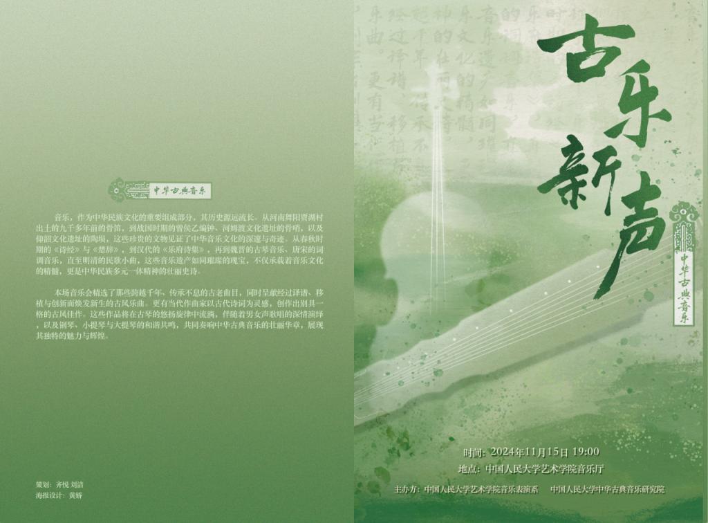 音乐表演系与中华古典音乐研究院联合呈现,共演奏了8个作品,展现了中华五千年文明中的经典音乐文化遗产,以全新的视角和形式诠释了古典音乐在新时代的独特魅力。