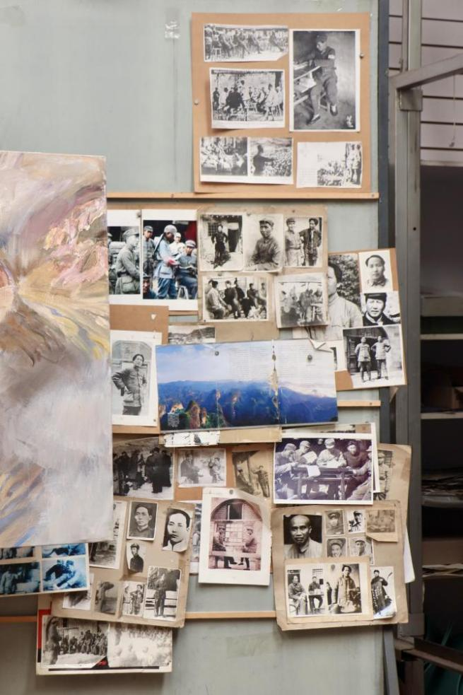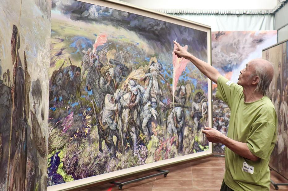 自邂逅长征图后,沈尧伊多次重走长征路。他采访健在的老红军,拿着画稿请教细节,只为还原历史真实。他深知长征时期缺少史实图像,自己有责任填补空白。为还原湘江战役,他沿滚滚江水考察;为捕捉飞夺泸定桥瞬间,他考证战术;为体会夹金山严寒,他雪线跋涉八小时。创作《遵义会议》时,他深入遵义地区,拜访老一辈革命家,考究每一位参会者的人物形象和性格特点,还对会议召开时的室内外环境、家具、用品等一一进行考证,最终通过手中的画笔再现改变中国命运的三天,用视觉语言刻画经典历史时刻。每幅巨作的背后,都沉淀着沈尧伊以脚步丈量长征路收获的真实感悟,更凝聚着他苦心孤诣搜集而来的详实史料。沈尧伊的艺术长征启示我们,精神传承不是简单复制符号,而是要在时代语境中重构表达。