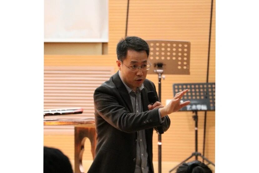 姚晨教授以《劝君更尽一杯酒》为例,系统阐释了古琴在当代音乐中的创新路径。他详细解析了作品如何通过多层次音乐素材的叠合与重构,将王维诗作的文学意象与《阳关三叠》的传统音调进行创造性转化,使古琴与小提琴、中提琴、大提琴形成跨文化对话。在音高组织上,他既保留了古琴特有的腔韵美感,又通过现代作曲技法对传统旋律进行变形发展;在音响结构上,通过乐器音色的对比与交融,构建出古今对话的立体空间。在进一步探讨中,姚晨以《西江月·世事一场大梦》为例,说明如何通过音乐参数控制实现意境的开放性。他提到,在为人声与古琴创作时,通过旋律起伏与音色疏密的精密布局,既形式化地捕捉苏轼词中的空灵之感,又为听众预留个人化的审美生发空间。