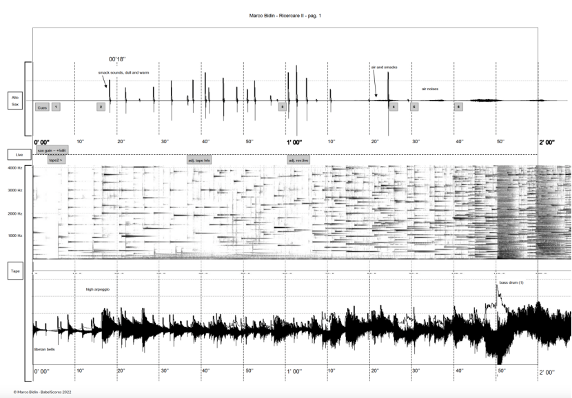与许多“以技术为中心”的创意研究不同,Bidin没有把“实时处理”当作作品的目的本身。他更愿意把它理解为“舞台声音组织”的一部分:话筒输入经分析、滤波、空间化、回声与动态均衡等模块处理,其参数受谱面与时间线约束,同时又留下足够的弹性以呼应现场。他还在系统中加入“实时录音叠加”的层:舞台上演奏的短句被捕捉、延迟、再现,像一支由影子组成的“数字乐队”围绕独奏者展开。这一设计既解释了“超常时值”的长音效果(人耳听到的不只是当下,也包括被延展与回放的先前内容),也使得空间化布局成为音乐结构的一部分,而不仅仅是声场的某种美化。