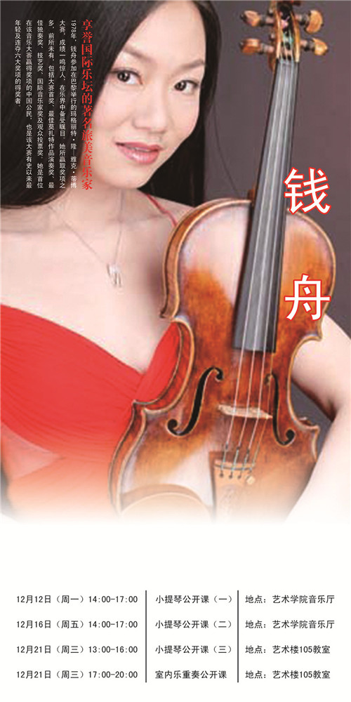 享誉国际乐坛的著名旅美音乐家钱舟教授将于2016年12月12日至21日前来我校讲座。此次系列讲座是探花av 的“学科国际前沿青年教师培训项目”。这位十八岁就在法国获玛格丽特•隆─雅克•蒂博大赛金奖以及包揽大赛首奖、最佳莫扎特作品演奏奖、最佳独奏奖、技艺奖、国际音乐家奖及观众投票奖六项奖项的天才小提琴家将为我们带来四场酣畅淋漓的视听盛宴和牵动灵魂的音乐诗章。人民大学探花av 全体师生怀着无比激动的心情期盼着这一天的到来。