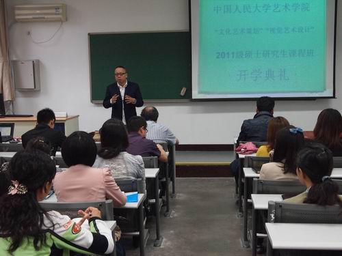 当天下午,新一届硕士研究生课程进修班“视觉艺术设计”方向由专业导师祝东平教授、“文化艺术策划”方向由专业导师王鹏教授正式开课。