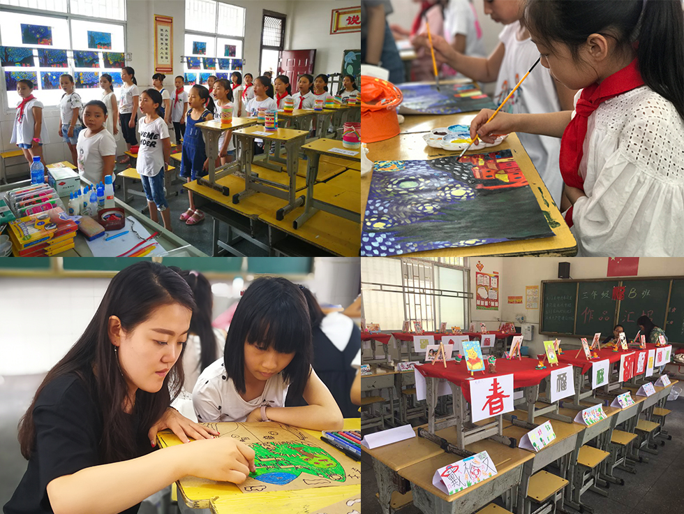 在五天的教学过程中,支教团同学共分八组担任三至五年级的任课教师,为小学生们系统而生动地讲授了点线面构成、色彩原理、中西方美术史等艺术课程,并以国画、剪纸、刮画、黏土、扇面、拼贴画等多元方式,引导小学生们探索艺术魅力,激发他们的想象力与创造力。其中,此次支教专门配备了一名音乐专业的学生党员走班授课,为各班学生普及音乐基础知识,教会各班学生共同演唱歌曲《在灿烂阳光下》。学习时间虽然短暂,但孩子们兴趣浓厚,积极主动,他们充分发挥动手能力,每个人都完成了四至五件出色的艺术作品。