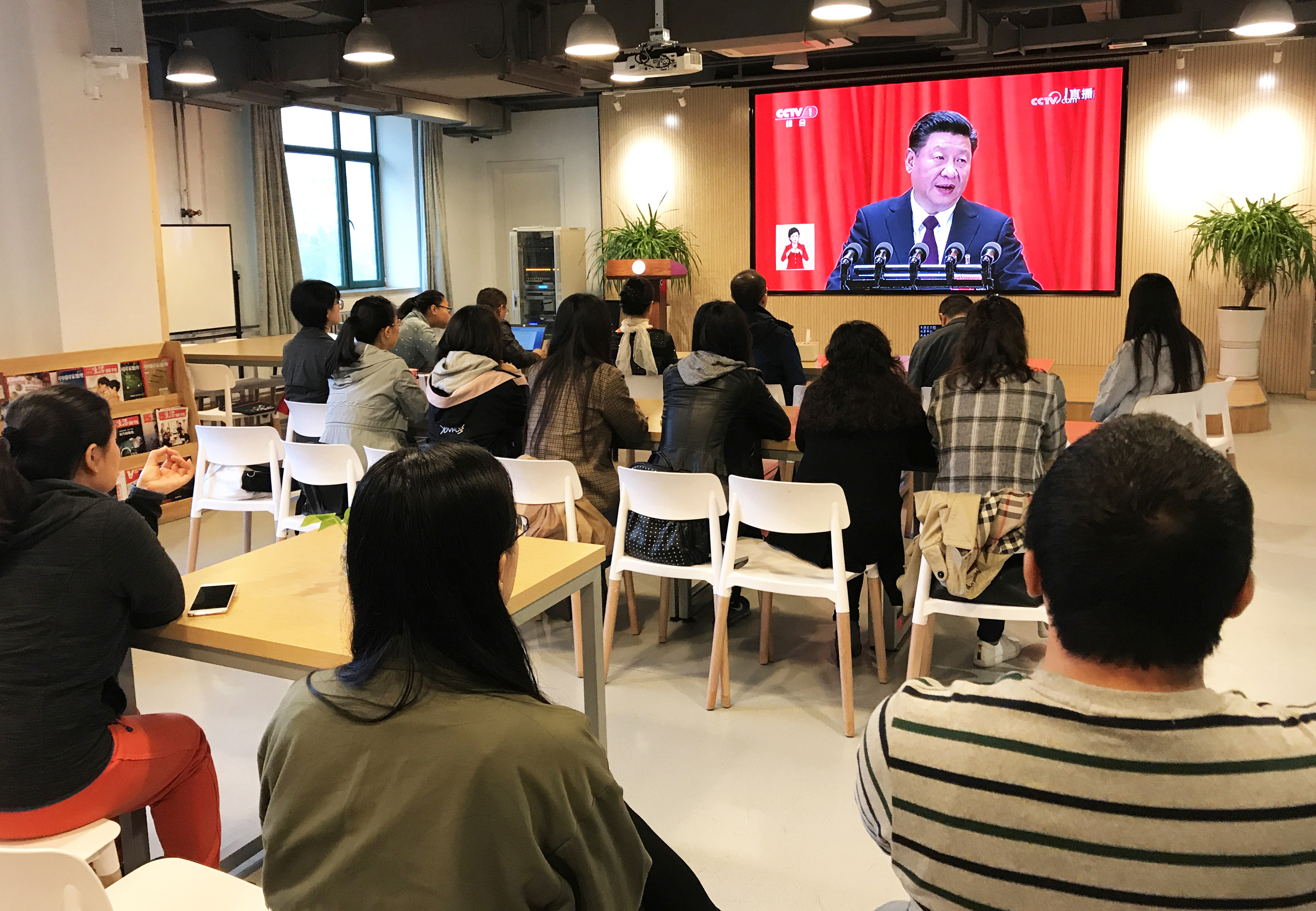 党总支副书记别敏、教工一支部书记刘明才、教工二支部书记陈炯、学生一支部书记乔侨、学生二支部书记黄月丽及师生党员、部分教职工在学院教师发展中心集体收看了十九大开幕会直播盛况。