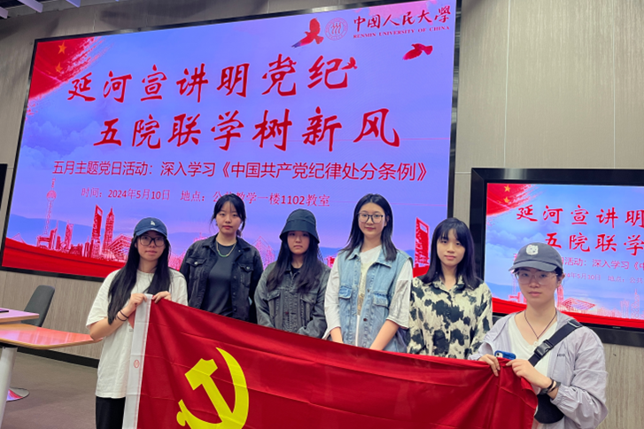 设计系学生第一党支部、劳动人事学院2023级硕士社会保障班党支部、2023级硕士劳动关系班党支部、本科第二党支部、本科第四党支部、2023级博士班党支部及人口与健康学院2022级人口学硕士党支部、农业与农村发展学院2023级硕士1班党支部、公共管理学院2023级硕士生1班党支部共9个党支部联合开展五月主题党日活动,活动主题为“延河宣讲明党纪,五院联学树新风——深入学习《中国共产党纪律处分条例》”。本次活动于公共教学一楼1102教室举行,由劳动人事学院2023级博士班党支部书记刘姜涛主持。