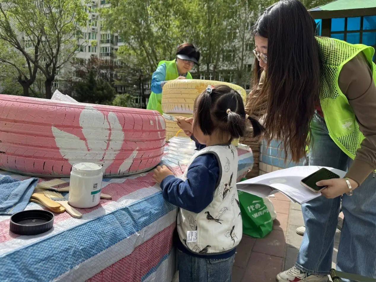 在实践过程中,同学们通力协作,连夜完成轮胎和背景板底漆刷涂,确保色彩的饱满持久和艺术效果的最终展现。社区的小朋友们也在同学们的指导下参与到轮胎涂色中,增添了更多童趣与活力。
