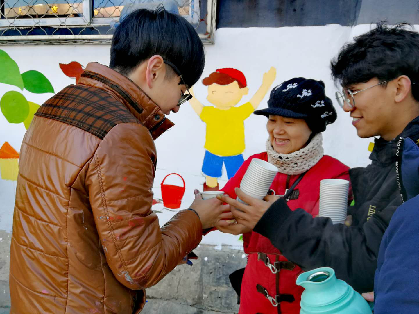 整个墙绘创作持续了五个小时,所有参与者都沉浸在精心细致的创作中。别敏副书记为大家送上驱寒暖心的姜汤,在简单的午饭后,同学们再次投入到创作之中。