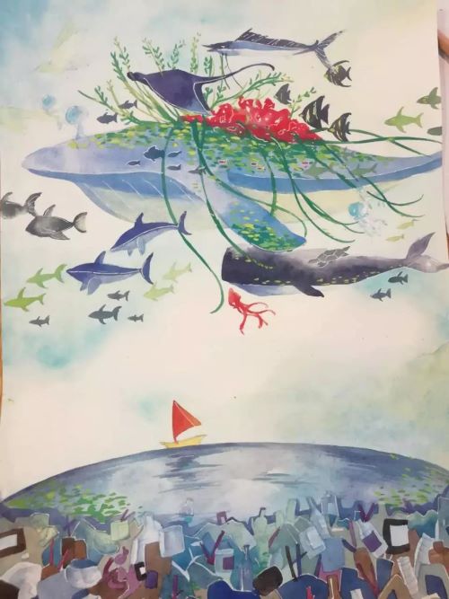 “我参与过关于海洋污染的活动,了解到海洋存在着塑料污染、石油污染、微塑料污染等等污染源,我在创作时想当如果海洋生物能够进化为在天空生存的话也就是逃离海洋,那么它们就可以远离污染。但是海洋生物无法离开海洋,我们可以类比一下,同样我们人类也不能真正离开地球。”