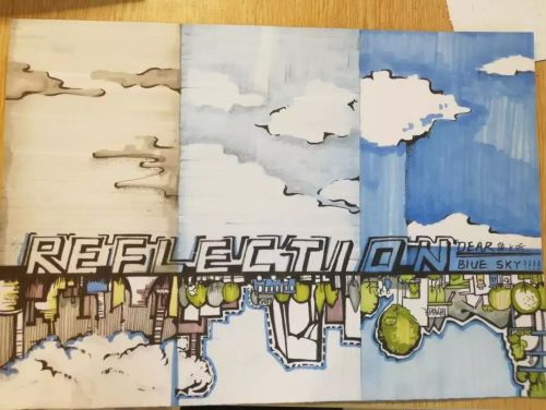 “我以《桃花源新景》为题,将传统山水与环保主题结合,是希望用铅笔简笔画的方式直观描绘一幅人们心中的圣地——桃花源在环境破坏下的图景。‘桃花源中无桃花,世外之地不世外’是我想表达的理念。桃花源是我们心中的圣地,在如今,如果我们不保护地球,任凭其收到破坏和污染,我们就可能失守最后一片桃花源,桃花源中就没有桃花,世外之地也不世外了。”