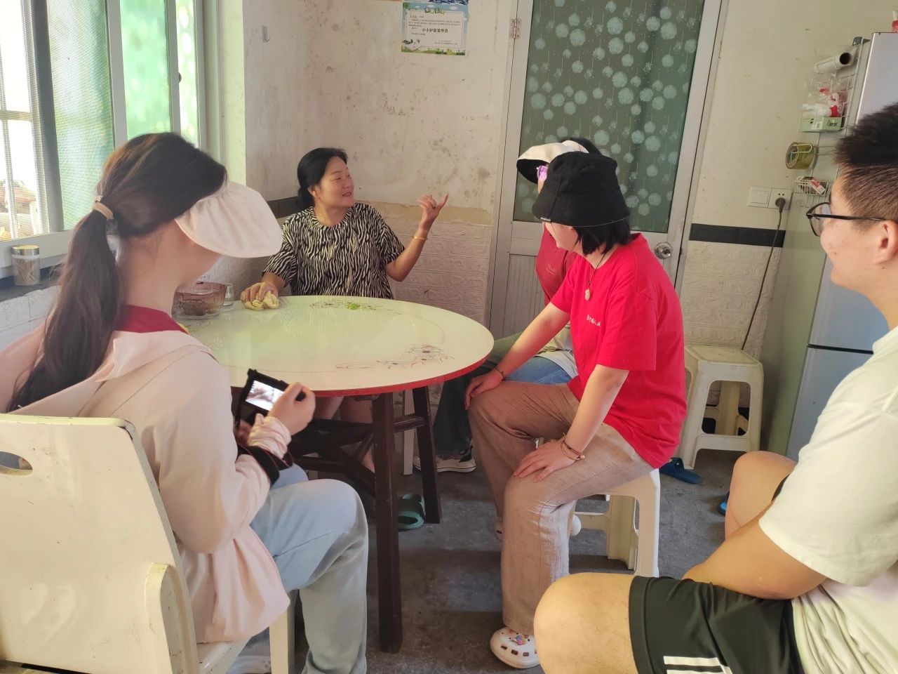 听说“花姐”是西圃村的一位种花高手,艺馨和汝灏专程前往“花姐”家中拜访学习,结果“花姐”说正在忙,没有时间,汝灏以为是这家村民不想被他们打扰,于是急匆匆的走了。面对这种情况,汝灏一时间摸不清到底什么情况,感觉和村民沟通十分困难,甚至开始和艺馨商讨如果“花姐”不教种花该怎么办的问题,可以说“花姐”的一句很忙使得两位同学内心十分失落和复杂。然而正当汝灏和艺馨商量下午再次拜访“花姐”的方式时,接到了“花姐”的电话。两人去到“花姐”家后,发现她竟然为团队的每位同学精心准备了手作茶饮,而且还提前放到了冰箱冷藏。“花姐”的第一句话便是解释上午很忙的原因:照顾孩子吃饭,送孩子上学,洗衣服,收拾屋子等等这些都是她上午的工作,就这样汝灏解开了心里的疑惑,开始与“花姐”边吃边聊,建立起了彼此的联结,为后面做“美学角落”打下了基础,同时也了解了村民的生活习俗,从那以后每次去入户调研都会选择在下午或者晚上,以迎合村民的生活习惯。