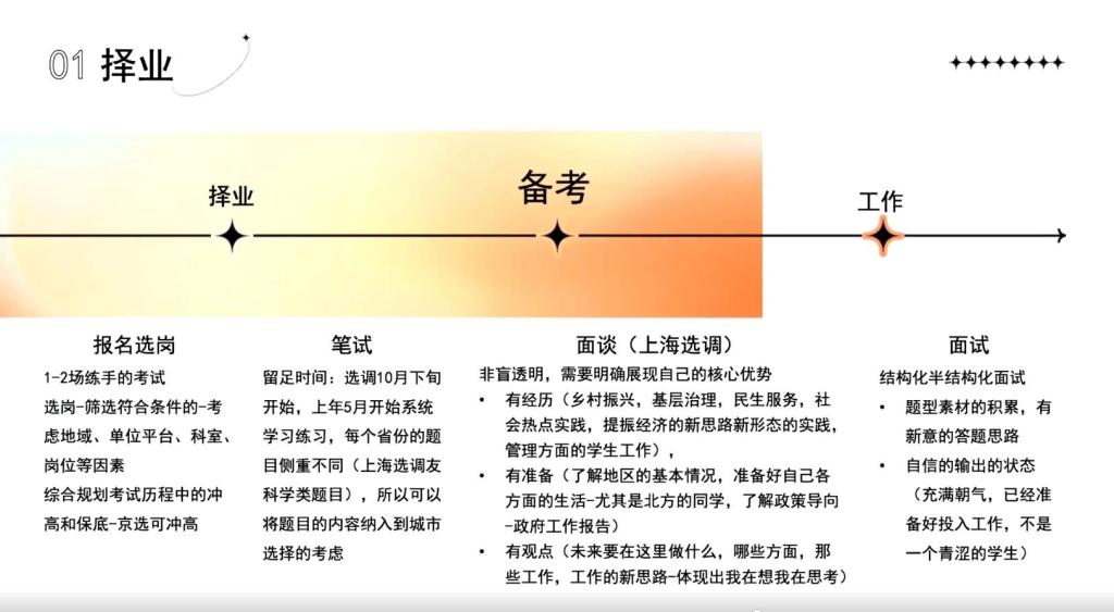 在分享中,陶同学重点介绍了事业单位联考的相关信息。她提到,相较于公务员考试,事业单位提供的艺术类岗位更为丰富,且其考试时间通常安排在每年三四月份进行笔试,五月进行面试,这使得考生可以在准备公务员考试的同时兼顾事业单位联考的准备。接着,陶同学从信息获取、笔试备考策略到面试准备等多方面,详细分享了参加事业单位联考时应注意的事项。