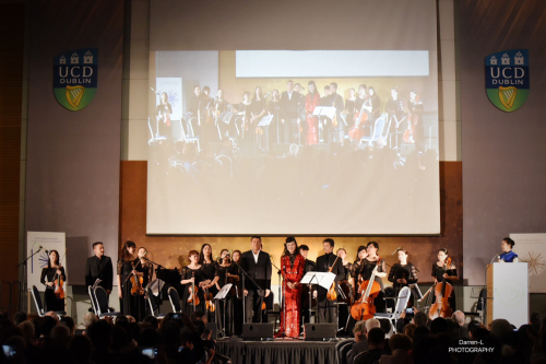 室内乐团应邀为观众们带来了具有中国和爱尔兰特色的音乐表演。女高音歌唱家郝丹丹身着一身红衣,歌声悠扬婉转,一曲《在中国大地上》引人入胜,随后的小提琴协奏曲《梁祝》和爱尔兰民歌《阿萨瑞原野》令人动容,引得阵阵掌声。台下的来宾对于中国几十年的奋斗发展历程纷纷表示赞叹,在场华人们的自豪之情溢于言表。