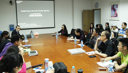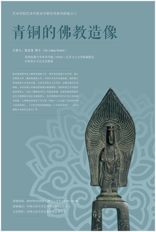 2015年5月20日下午,英国伦敦大学亚非学院(SOAS)艺术与人文学院副院长、中国考古艺术史系教授Lukas Nickel(倪克鲁)先生应我院艺术学系邀请,举办了以“青铜的佛像造像”为主题的学术讲座。讲座由艺术学系主任王文娟老师主持并评议。哲学院王旭晓教授、艺术学系张建宇老师、中央美院郑岩教授、中国社科院文学所王敏庆女士等诸多师生到场聆听。