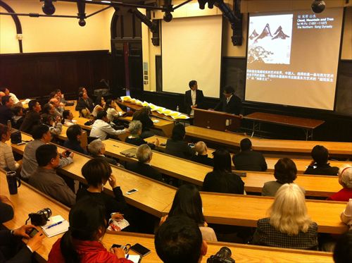 郑晓华教授从前哈佛大学教授、美国著名学者塞缪尔•亨廷顿(Samuel•Huntington)所提出的“文明冲突论”切入,联系中西艺术的不同藝術观念和思想,阐述了中国艺术的特独性及其普遍意义,同时对中国漢字书写為什么能够发展成為一门純藝術做出了解释。报告结束后,徐庆平、郑晓华、吴震启、胡传海和兰干武五位书法家现场挥毫,共同创作了“跨洋过海翰墨传友情”的组合作品。