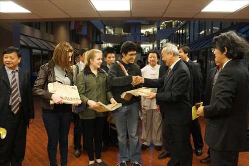 开幕酒会上徐庆平院长代表学院向乔治城大学东亚系同学赠书法学习用品