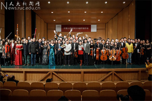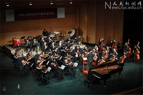 音乐比赛获奖学生代表先后联合演奏了莫扎特《降E大调交响协奏曲第三乐章》、贝多芬《第五钢琴协奏曲第一乐章》、格里格《a小调钢琴协奏曲第一乐章》等经典曲目,激越昂扬的乐章为现场观众带来了一场视听盛宴。在男高音独唱《延安颂》的豪迈歌声中,整场音乐会掀起高潮,大气磅礴的旋律生动再现了延安精神鼓舞人心的战斗气息。《默默静听》二重唱、歌剧《卡门》选段、《爱情像一只自由小鸟》、《蓝色多瑙河》等曲目以精湛的演奏技艺和动感的美妙音符,向全校师生传递了新年的美好祝福。最后,和着全场观众整齐划一的鼓掌节拍,在返场曲目《拉德斯基进行曲》动感欢快的乐声中,音乐会落下帷幕。