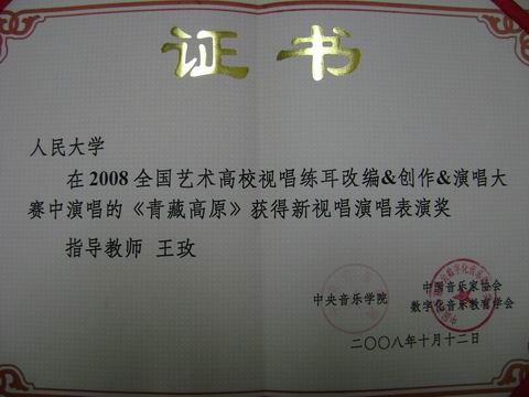 2008年10月12日,国际视唱练耳教学论坛曁中意视唱练耳教学艺术周的颁奖仪式在国家大剧院举行。我院音乐系学生演唱的混声合唱《青藏高原》获得了新视唱演唱表演奖。指导教师为王玫副教授。