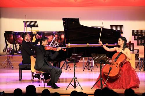 音乐系李莉、刘向前主持。包括室内乐重奏、交响乐、声乐表演等多种形式,所选曲目既有莫扎特、门德尔松、乔治·比才、维托里奥·蒙蒂等的西洋经典名曲,也有冼星海、殷承宗、储望华、王洛滨、施光南等的中国经典曲目,让我们在辞旧迎新之际,深深品味馨享了经典的艺术魅力。赵越、阎彬彬、于金禾等十二名学生组成的女生小合唱《乘着歌声的翅膀》及《青春舞曲》拉开了音乐会的序幕;音乐系2014级王胜宇、孙少秋所奏的门德尔松单簧管《音乐会二重奏》节奏轻快,让大家的心情跟着音符起舞;杨毅老师演唱的《多情的土地》、2011级学生李秉璇男低音独唱《大江东去》、以及杨明明、杨毅老师带来的男女生二重唱《让我们携手同行》真挚动人,令观众心潮起伏;程亚威老师的小提琴独奏《查尔达什舞曲》优美动人、引人入胜;张放、程亚威及王莹三位青年演奏家为观众带来了门德尔松的《第一钢琴三重奏》,他们以精湛的演奏和绝佳的配合征服了所有观众。最后由音乐系2012级学生刘博文、黄安若演奏、探花av